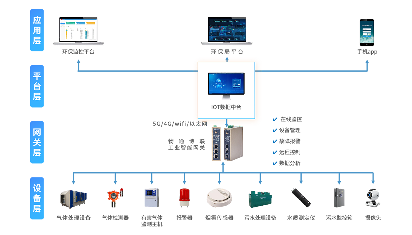 通過物通博聯工業智能網關對生產的廢水,廢氣、廢料等污染源進行在線監測,采集工廠環保設備的運行數據、污染物排放數據,上傳至環保監控云平臺,通過平臺管理人員能夠實現實時監控、遠程管理、預警報警、數據分析、遠程控制等功能,幫助工廠實現環保管理的數字化、智能化。同時也可以按照要求發給環保平臺,滿足監管需求。