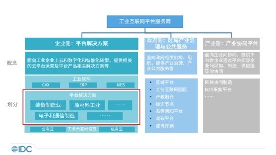 為此,IDC按客戶和服務(wù)類型,將中國(guó)工業(yè)互聯(lián)網(wǎng)平臺(tái)服務(wù)商市場(chǎng),梳理劃分成政府側(cè)、企業(yè)側(cè)和產(chǎn)業(yè)側(cè)三類市場(chǎng)。其中政府側(cè)主要通過提供產(chǎn)業(yè)治理和公共服務(wù)的形式,面向省市區(qū)政府及相關(guān)機(jī)構(gòu)提供區(qū)域平臺(tái)、工業(yè)互聯(lián)網(wǎng)園區(qū)等解決方案。企業(yè)側(cè)市場(chǎng)主要面向工業(yè)企業(yè),通過平臺(tái)及解決方案的形式,為企業(yè)提供上云上平臺(tái)以及數(shù)字化、智能化解決方案。產(chǎn)業(yè)側(cè)則主要通過平臺(tái)實(shí)現(xiàn)企業(yè)間的業(yè)務(wù)協(xié)同。