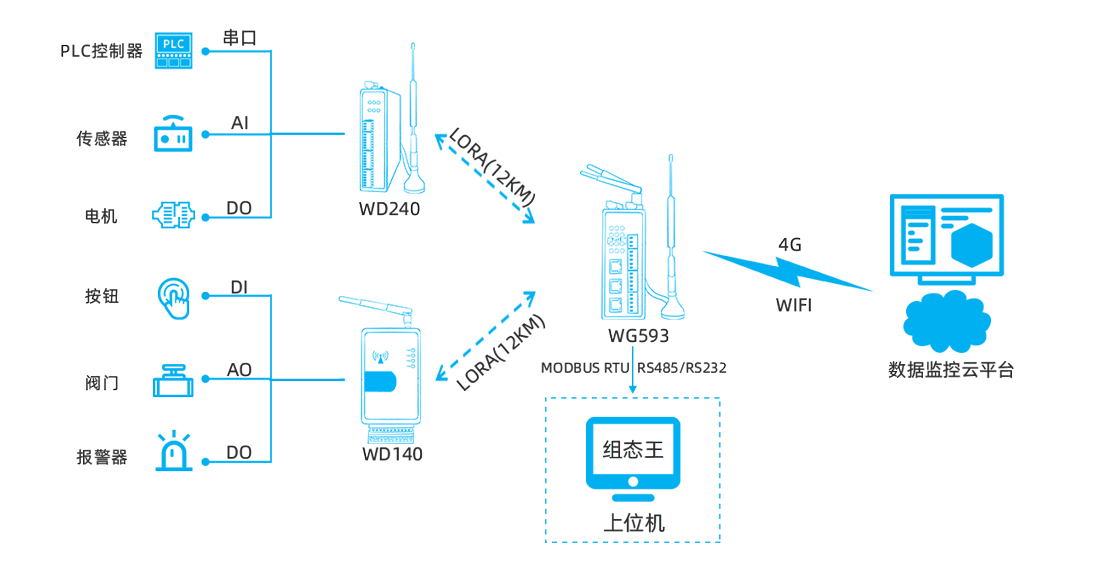 | 示例 | WD240-LM0844-485(8AI-4DI-4DO,國內頻段:410~493MHz,485串口) WD240-LM0484-232(4DI-4AI-4DI-4RO,國內頻段:410~493MHz,232串口) WD240-LM0448-485(4DO-4AI-4DI-4RO,國內頻段:410~493MHz,485串口) WD240-LM2644-232(2AO-6AI-4DI-4RO,國內頻段:410~493MHz,232串口) WD240-LM0844-485(8AI-4DI-4DO,海外頻段:850~930MHz,485串口) WD240-GM0844-485(8AI-4DI-4DO,4G CAT1,485串口)等 |