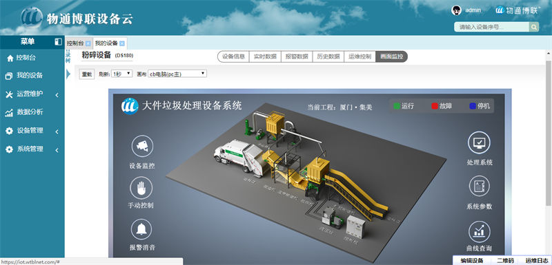 物通博聯處理垃圾設備物聯網為垃圾處理設備廠家實現全球設備統籌,打造一個安全監控、設備遠程維護和管理、設備遠程調試、配件管理、故障告警為一體的垃圾處理設備綜合服務平臺,實現從“生產型制造”向“服務型制造”的轉型,提升生產效率、產品質量和技術支持水平。