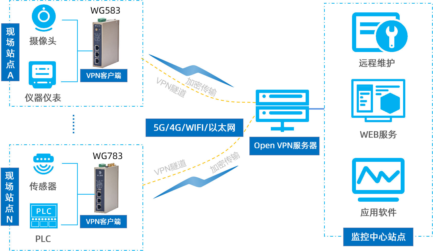 物通博聯OpenVPN網關通過對工業現場包括PLC、儀表、傳感器或者工控機等在內的設備進行實時狀態、參數、故障等數據的采集,通過5G/4G/ WIFI/以太網等聯網方式將數據上傳至服務器進行儲存(通過網關為VPN客戶端利用OpenVPN技術在原有網絡基礎上建立一個加密的虛擬網絡通道,實現數據加密傳輸,保障數據的安全性和完整性),即可在數據中心將其顯示、分析,從而了解現場環境以及現場設備的相關信息參數以及運行情況,實現對現場設備的遠程監控、數據分析、遠程維護。