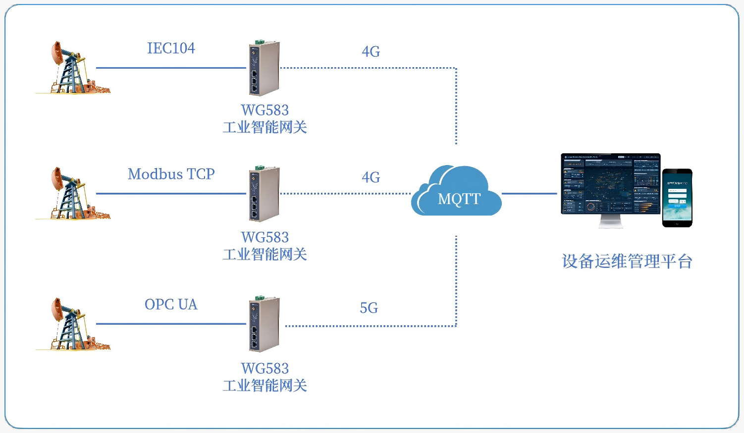 WG583網關支持邊緣側數據預處理,過濾無效數據并進行標準化轉換,隨后以5G/4G網絡通過輕量級MQTT物聯網協議進行數據對接到智慧油田管理平臺中,通過多網互備、斷網重連、斷點續傳、安全加密等多種功能,保障數據安全完整傳輸。